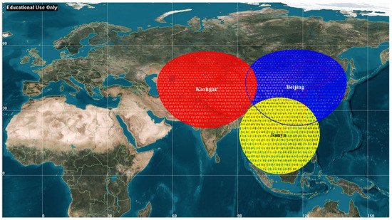 This work adopts one sun-synchronous circular EO satellite with orbital height of 500 km [1], whose repeat period is 31 days. For all scenarios investigated herein, three typical G/Ss have been selected in China: Kashgar (latitude 39.50° N, longitude 75.92° E), Beijing (latitude 40.45° N, longitude 116.86° E) and Sanya (latitude 18.31° N, longitude 109.30° E), which are representative of temperate continental, temperate monsoon and tropical monsoon climate conditions, respectively [25]. For Kashgar, Beijing and Sanya G/S, the annual probability of rain is 0.38%, 1.94% and 2.46%, and the point rainfall rate for 0.01% of an average year is 9.42 mm/h, 42.56 mm/h and 81.09 mm/h, respectively. Therefore, the selected G/Ss can be representative of three typical states of drought, moderate rainfall and abundant rainfall in China.