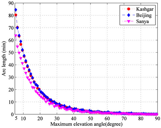 By calculating the duration falling into the inter cell range within elevation angles from 5° to 90° at an interval of 1°, the results are clearly shown in Figure 2. It can be seen that the distribution trend of three G/Ss is similar, which decrease rapidly with the increase of elevation angles, and a large number of transmission arc segments are located in the area with small elevation angles.