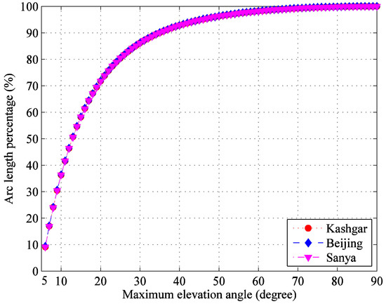 Figure 3 shows the cumulative distribution of transmission arc segments from the minimum 5° elevation angle. It can be seen that the data laws of three G/Ss are basically the same, and the proportions below 10°, 20° and 30° are about 36%, 72% and 86%, respectively. In order to improve the transmission efficiency, we should make full use of the long transmission arc segments with small elevation angle and increase the useful data rate.