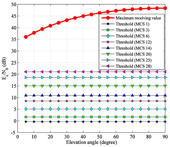 Ignoring the atmospheric attenuation, for the eight MCSs selected in Section 2.2, the maximum ES/N0 available at the G/S and the demodulation threshold values considering total degradation are shown in Figure 4. It can be seen that as the elevation angle increases from 5° to 90°, the maximum ES/N0 in clear sky available at the G/S increase from 36.01 dB to 48.39 dB, which are beyond the threshold values of all MCSs. The variation range of ES/N0 in clear sky reaches 12.38 dB. Therefore, under this ideal condition, the reliable data transmission can be achieved through the satellite-to-ground link.
