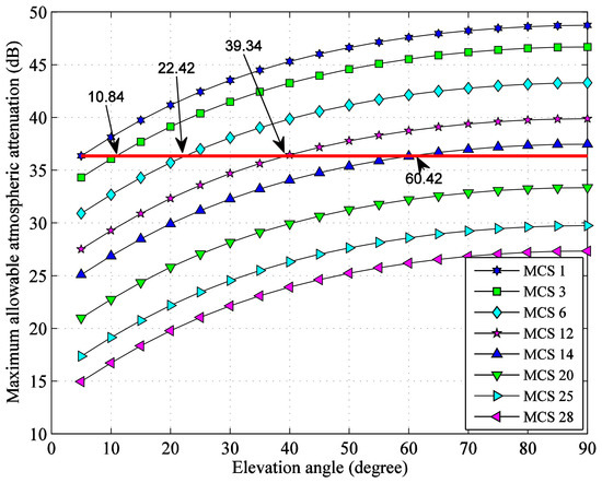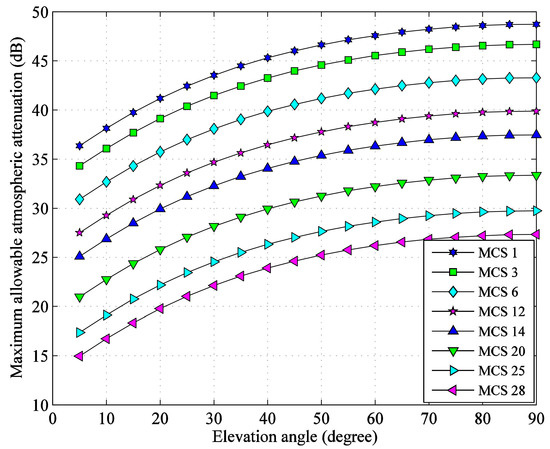 From Figure 4, the maximum allowable atmospheric attenuation values of the eight selected MCSs at different elevation angles can be obtained, as shown in Figure 5, which can be used for link availability analysis.