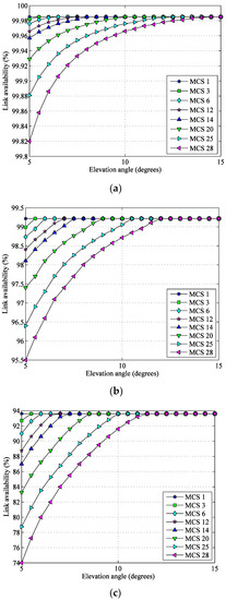 Link availability of each MCS at different elevation angles. (a) Kashgar G/S; (b) Beijing G/S; (c) Sanya G/S.