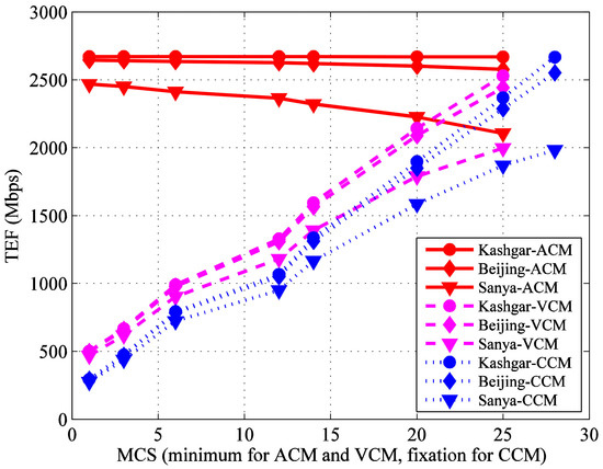 - The TEF increases with the increase of CCM’s MCS or VCM’s initial minimum MCS. As shown in Table 1; Table 4, for CCM, the useful data rate increases rapidly with the increase of MCS, but the link availability decreases relatively slowly. So, the CCM TEF, which is the product of the link availability and the useful data rate, still increases. VCM is similar with CCM.