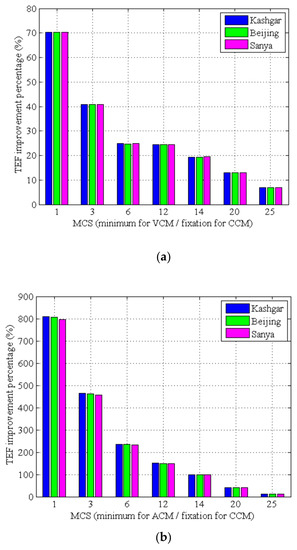 To analyze the transmission efficiency improvement quantitatively, the TEF of VCM, ACM and CCM are compared, respectively. The improvement percentages are obtained, as shown in Table 8 and Figure 9. For any G/S, it can be seen that: