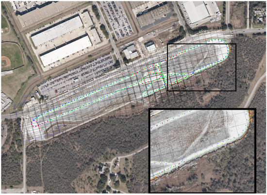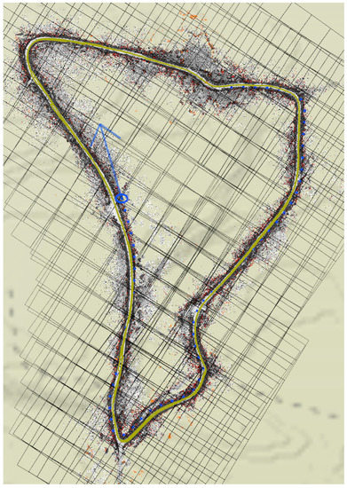 This shows the creation of a map with significant GPS dropouts. Due to the optimization, the map tiles without GPS samples are stretched toward those containing GPS samples, resulting in a locally consistent and as globally optimal as possible map. This is preferable, for autonomous vehicles, to maps with tears or gaps in the data.