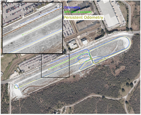Figure 8. In the case that the original map was produced with GPS, the fused state estimate is accurate with respect to geolocated coordinates. Otherwise, the fused state estimate is still accurate with respect to the map, but both are warped with respect to geolocated coordinates. In both situations, the Persistent Map localization provides map-relative localization accuracy similar to or better than that of GPS. The Robotic Technology Kernel navigation suite is robust to this level of inaccuracy, and thus this enhancement allows these vehicles to operate normally in previously traversed areas even when GPS data are completely inaccessible.