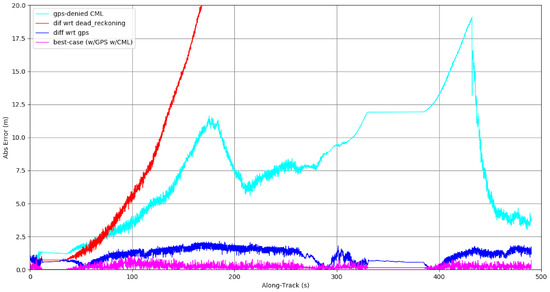 Figure 11 shows that, while the persistent map generated is stretched and warped with respect to ground truth (observe the road, for example in the satellite imagery and the persistent map), the localization correctly places the vehicle in the center of the road in the persistent map. In this experiment, a vehicle drove in a desert environment for ≈3.2 km without GPS. By the western end of the track, the dead reckoning state estimator had drifted by ≈30 m, more than enough to cause the estimated vehicle to be completely off the wide road, and to miss the planned turn. While the generated map is off from the actual geo-located positions of the features, they are locally consistent and useful for navigation and planning. Thus, when the vehicle re-traverses this same area on a different day, again without the benefit of GPS, CML is able to localize the vehicle to a sufficient precision to allow automated route following.
