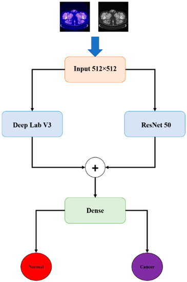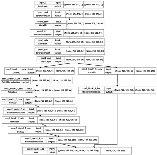 In this model, we employed DeeplapV3 [37] and ResNet-50 [38] as pre-trained models on the ImageNet image collection to take advantage of their foreknowledge and the weights found by using them. Figure 3 shows the first part of the model, in which the input size is 512 × 512, with a total parameter value of 17,869,697. This model consists of nine blocks. The first block contains one 2D convolution layer, one 2D max-pooling layer, and one batch normalization layer with a ReLU activation function. The second block contains 10 2D convolution layers, 3 additional layers, and 10 batch normalization layers, followed by ReLU activation functions. The third block consists of 13 2D convolution layers, 4 additional layers, and 13 batch normalization layers, followed by ReLU activation functions. The fourth block consists of 19 2D convolution layers, 6 addition layers, and 19 batch normalization layers, followed by ReLU activation functions. The next block consists of one average pooling layer and four 2D convolution layers, followed by four batch normalization layers, and one concatenation layer followed by four activation layers. Block number 6 contains two 2D convolution layers, followed by two batch normalization layers; one concatenation layer, followed by one activation layer; and one global average 2D pooling layer, followed by two dense layers. The remaining blocks each consist of one 2D convolution layer, followed by one batch normalization layer with an activation function. In addition, there is one global average 2D pooling layer, followed by two dense layers.