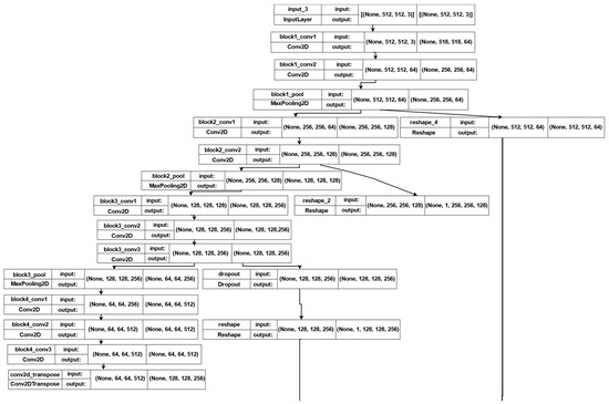 In this model, we employed VGG-16 [43], ResNet-50V2 [44], U-Net [45], and LSTM [46] as pre-trained models. Figure 4 shows the first part of the model, in which the input size is 512 × 512, with a total parameter of 11,829,569. This model consists of seven blocks. The first and second blocks contain two 2D convolution layers and one 2D max-pooling layer for each block. The third block contains three 2D convolution layers, followed by one 2D max-pooling layer. Block number 4 consists of two 2D convolution layers and one batch normalization layer, followed by one dropout layer with a ReLU activation function. In addition, this block has one concatenation layer, followed by two 2D convolution layers, two transpose layers, one batch normalization layer, and three 2D convolution LSTM layers. The other blocks have the same structure as block 4. The following layers were added to the model:
