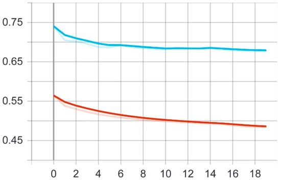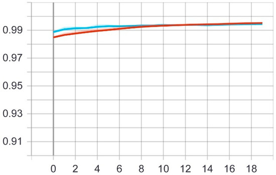 Accuracy (red line) and validation (blue line) convergence curves of the second model over 20 epochs.