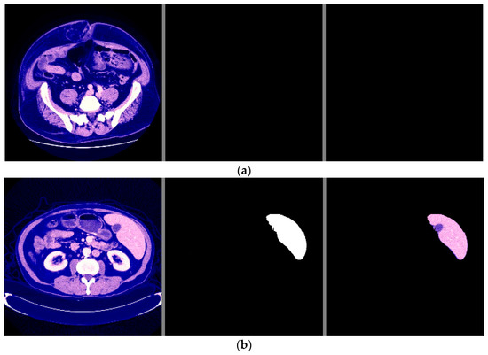 The visual results of the second model for cancer detection on LiTS dataset: (a) normal case (no tumor detection); (b) abnormal case (tumor detection).