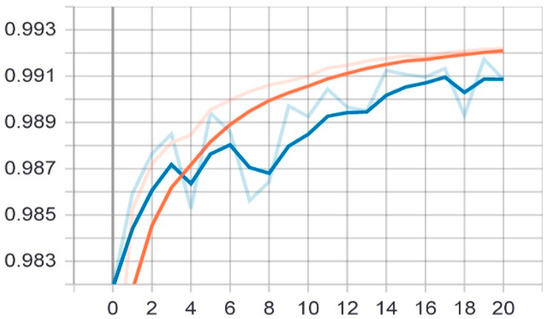 The second proposed model was tested on the same test set that was applied to the first model. The model was trained on 20 epochs according to the previous set of data and divisions, and as shown in Figure 8, the drawing of the accuracy curve and the validation accuracy curve converged, providing evidence that the training stabilized after 16 epochs, and there was an increase in accuracy. Through these functions, the model was trained on the training sample and then checked its results against the aforementioned test sample, which improved the values of the hidden coefficients for the last layer in the model in order to match the images to be trained in each phase.