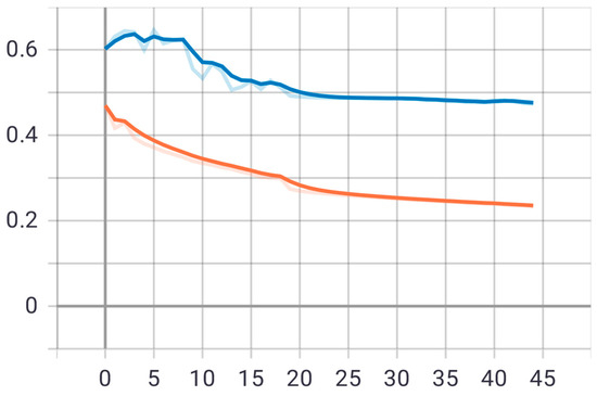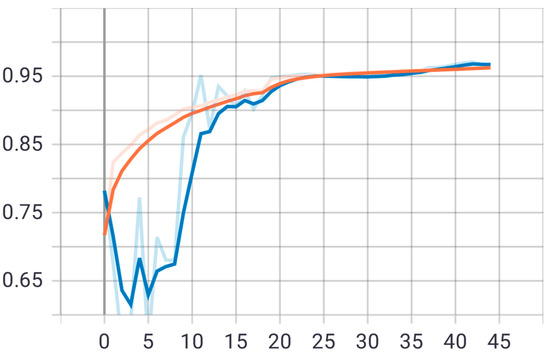 The second proposed model was tested on the same test set that was applied to the first model. The model was trained on 45 epochs according to the previous set of data and divisions, and as shown in Figure 14, the drawing of the accuracy curve and the validation accuracy curve converged, providing evidence that the training stabilized after 20 epochs, and there was an increase in accuracy. Through these functions, the model was trained on the training sample and then checked its results through the aforementioned test sample and improved the values of the hidden coefficients for the last layer in the model in order to match the images to be trained in each phase. This process was repeated for all training epochs, and in epochs 25 and above, it was noticed that this accuracy did not improve more than a certain threshold, meaning that every time the model was trained on a set of images from the training sample, it checked images in the validation sample and obtained a certain accuracy. In this case, the accuracy reached 0.984, meaning that the accuracy of the model during the training and validation phases was 98.4%. The loss curve of the second model is also shown in Figure 15.