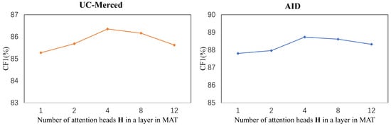 We demonstrated the effectiveness of each component in our proposed approach. In this part, we explore the performance curve of our proposed method by varying the number of attention heads. To avoid the effect of masked attention, we exploited standard dot-product attention instead of masked attention in this part. We set the number of layers in Transformer and gradually increased the number of attention heads H from 1 to 12. The results are shown in Figure 4. The performance curves across UC-Merced Multi-label and AID Multi-label are similar. Appropriately increasing the H of multi-head attention enhances the performance of . However, when there are too many attention heads, the performance drops since not enough features are assigned to each attention head. When the number of attention heads , the performance of reaches its summit.