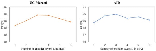 To evaluate the effect of the different number of layers L in Transformer on , we changed L from 1 to 6. To avoid the effect of masked attention, we exploited standard dot-product attention instead of masked attention in this part. Following the best setting in the last part, the number of attention head H was set to 4. In Figure 5, we show the result of varying the number of layers in Transformer. The results show that the performance of ascends to the peak when three layers are stacked. By stacking more layers, the performance drops continually on both the UC-Merced and AID datasets.