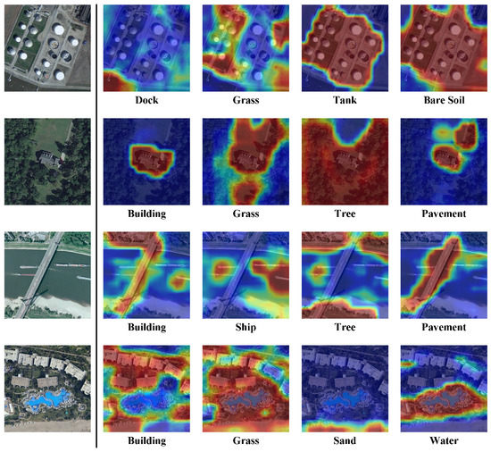 To investigate the capability of locating the position of each category in the image, we visualize the class-specific activation map M in the SDM. Some qualitative results are shown in Figure 7. Each row presents the raw image and the corresponding class-specific activation map of each ground-truth label. We can find that the SDM is able to locate the corresponding region of each category in the image. For instance, the ground-truth labels of the raw image in the third row are “building”, “ship”, “tree”, and “pavement”. Our SDM module can provide accurate localization of these four categories. In addition, the accurate activation map leads to more precise label embeddings for modeling the inter-class dependencies in MAT.