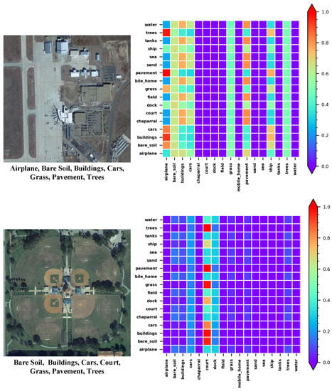 To further demonstrate the effectiveness of our method, we visualize the relationship matrix in the last layer of MAT. Partial results of the visualization are shown in Figure 8. Each row in Figure 8 consists of a raw image and the visualization of the corresponding relation matrix in MAT. We can observe that our proposed MAT is able to explore and capture the accurate label dependencies. Specifically, for the input image in the first row, the ground-truth labels are (“airplane”, “bare soil”, “buildings”, “cars”, “grass”, “pavement”, “trees”). In the relation matrix on the right, we can find that A(trees, airplane), A(pavement, airplane), A(grass, airplane), A(buildings, airplane), and A(bare soil, airplane) are ranked top in the column of “airplane”. This indicates that the correlations between the label pair (“trees”, “airplane”), (“pavement”, “airplane”), (“grass”, “airplane”), (“buildings”, “airplane”), and (“bare soil”, “airplane”) are higher than the others (greater than 0.7). Meanwhile, for the input image in the second row, the ground-truth labels are (“bare soil”, “buildings”, “cars”, “courts”, “grass”, “pavement”, “trees”). In the relation matrix on the right, we can find that A(trees, courts), A(pavement, courts), A(grass, courts), A(cars, courts), A(buildings, courts), and A(bare soil, courts) are ranked top in the column of “courts”. This indicates that the correlations between the label pair (“trees”, “courts”), (“pavement”, “courts”), (“grass”, “courts”), (“cars”, “courts”), (“buildings”, “courts”), and (“bare soil”, “courts”) are higher than the others (greater than 0.7). These convincingly demonstrate that our proposed method can explore, capture, and exploit the label relationships in specific images.