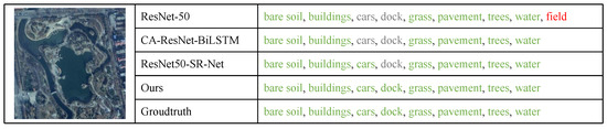 Figure 9 shows a qualitative example on the AID Multi-label dataset. The first column is the input image. The second column and the third one are the methods and the output predictions, respectively. Green labels denote true positive; red labels denote false positive; gray ones denote false negative. We can find that the baseline ResNet-50 failed to distinguish the objects with similar appearances, such as “trees”, “grass”, and “field” since the model only utilizes the global spatial features. The other methods obtain a lower false positive rate than the baseline by dealing with label dependencies. Those inconspicuous objects, such as “cars” and “dock”, can not be recognized by ResNet-50 and CA-ResNet-BiLSTM. While SR-Net misses the prediction of “dock”, S-MAT can recognize both “cars” and “dock” accurately and obtain a better performance.