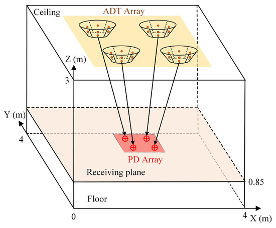In this section, we consider a general indoor MIMO-VLC system model, and its geometric setup is illustrated in Figure 1. An ADT array consisting of ADTs are installed on the ceiling and used as transmitters to transmit data. The PD array composed of PDs is located at the user plane. Usually, the light received by the PD consists of two parts: one is the LOS component, and the other is the non-line-of-sight (NLOS) component. Previous studies have shown that the power of the LOS component is usually much larger than that of the NLOS component [9]. Therefore, we only consider the influence of LOS component on the MIMO-VLC system performance in the following.