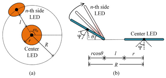 We assume that each ADT consists of totally N LEDs, including one center LED and inclined side LEDs. More specifically, the center LED is placed horizontally, while the side LEDs are inclined with the same inclination angle. It is further assumed that all the LEDs in the ADT have the same optical and electrical performance and the same radius r. The top view and the side view of the designed ADT are illustrated in Figure 2a,b, respectively. It can be seen from Figure 2a that the side LEDs are placed at the circumference of a circle with radius R, while the center LED is located at the center of the circle. Moreover, the gap between the center LED and the side LED is l, and the azimuth angle and the inclination angle of the n-th side LED are and , respectively. The azimuth angle can be given as follows: