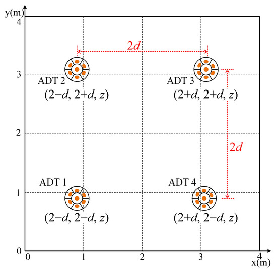 Figure 3 illustrates the placement of four ADTs in the ceiling by considering an indoor MIMO-VLC system with , where the coordinates of the four center LEDs in the four ADTs are , , and with unit meter. Hence, the spacing between two adjacent ADTs is . As the coordinates of the center LED in each ADT are known, the LOS channel gain of the center LED in the m-th () ADT to the i-th () PD, i.e., , can be calculated by using (1).