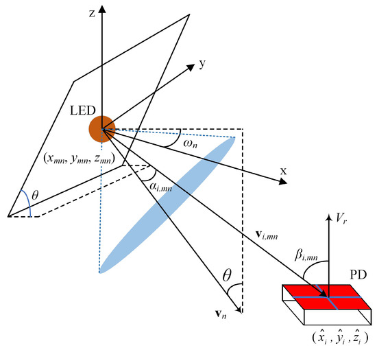 As the azimuth angle and the inclination angle of the side LED change, the emission angle from the n-th side LED in the m-th ADT to the i-th PD changes accordingly. Let denote the normal vector of the plane of the side LED and represent the vector from the side LED to the PD; hence, we have: