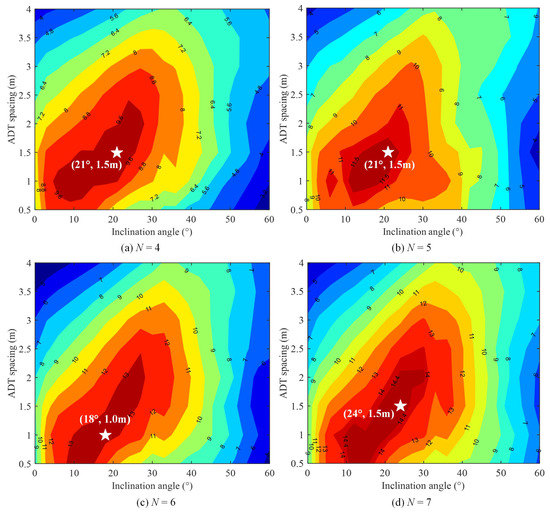First, we evaluate the average achievable rate with respect to the inclination angle and the ADT spacing for the ADTs each consisting of N LEDs. By setting with a step of and [0.5 m, 4 m] with a step of 0.5 m, we aim to obtain an optimal combination of and that can maximize the average achievable rate of the 4 × 4 MIMO-VLC system for a given N value. Figure 5a–d show the contours of the average achievable rate versus the inclination angle and the ADT spacing with a transmitted SNR of 150 dB for N = 4, 5, 6 and 7, respectively. As we can see, the optimal combination of and to achieve the maximum average achievable rate for each case is highlighted in the white star in Figure 5.