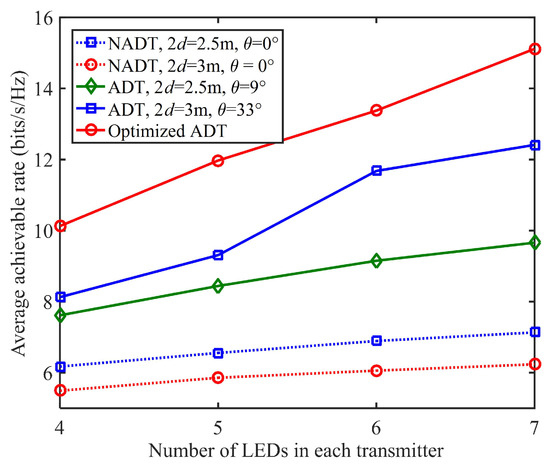 As we can see, the average achievable rates are all gradually increased when there are more LEDs in each transmitter for all types of transmitters, which suggests the advantage to design the transmitter with more LEDs under the conditions of increased complexity and cost. Particularly, the improvement of average achievable rate is much more significant for the optimized ADT in comparison to the conventional NADT when increasing the number of LEDs in each transmitter. For example, the average achievable rate using NADT with = 2.5 m, and = is improved from 6.2 to 7.1 bits/s/Hz when the number of LEDs in each transmitter is increased from N = 4 to 7, which corresponds to an average achievable rate improvement of about 14.5%.