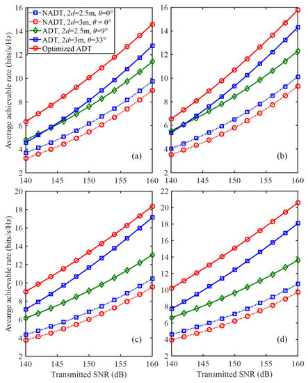 For example, for the case of N = 5, the required transmitted SNRs to reach an average achievable rate of 8 bits/s/Hz for NADT with = 2.5 m and = , non-optimized ADT with = 2.5 m and = and optimized ADT are about 155, 149 and 144 dB, respectively. Hence, transmitted SNR reductions of 11 and 5 dB are obtained by using optimized ADT in comparison to that using NADT with = 2.5 m and = and non-optimized ADT with = 2.5 m, respectively.
