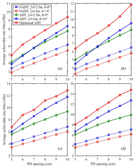 Average achievable rate vs. the spacing between two adjacent PDs in the generalized ADT with different N values for (a) N = 4, (b) N = 5, (c) N = 6 and (d) N = 7.