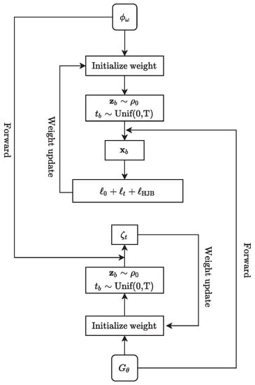In this section, we propose a generative-adversarial-network (GAN)-based approach to solving the high-dimensional MFG in (25). Inspired by Wasserstein GANs [], APAC-Net [,], we use the variational primal–dual structure of MFG and phrase (25) as a convex–concave saddle-point problem. Then, we propose a GAN-based algorithm to solve the complex-scenario MFG in (25).