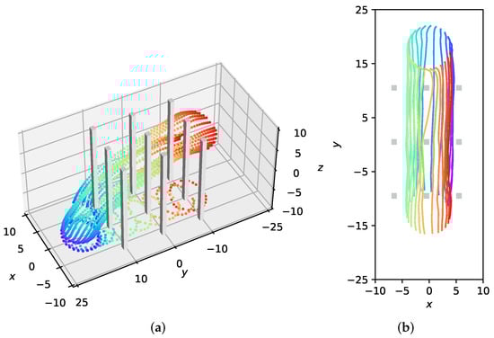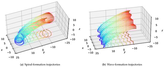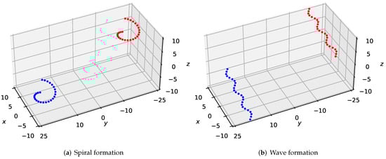 To validate the feasibility and robustness of our method for large-scale UAVs formation, we simulated twenty-five drones flying in desired formations from the bottom left side to the top right side in the 3-D scene, as shown in Figure 2. We experimented with two forms of formations—spiral formation and wave formation, which could confirm the generality of our approach. In Figure 2a, we set the initial points of the drones as , ; the target points of the drones are , . In Figure 2b, the initial points of the drones are , ; the target points of the drones are , .