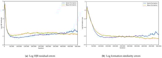 The convergence of our proposed MFG control algorithm and the effectiveness and stability of formation control under different forms of formations are shown in Figure 4. In Figure 4a, we plot the HJB residual errors, i.e., in Algorithm 1, which shows the convergence of MFGC. Without an efficient strategy control, the HJB residuals under different formations are relatively high. HJB residuals drop fast after we apply a series of controls. After around iterations, the error curves tend to be stable when we obtain an optimal control for UAVs. In Figure 4b, we plot the formation loss. Without a proper design of the formation cost term, there is no effective formation control, and the formation loss under different formations is relatively high. Formation loss drops fast after we apply our formation cost term. After around iterations, the error curves tend to be stable when we obtain an optimal formation control for UAVs.