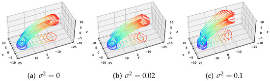 We investigate the effect of the volatility term on the behavior of the MFGC solutions—the executed trajectories for the formation flight of large-scale UAVs. In Figure 5, we show the solutions for MFGCs using , and . As increases, the density of UAVs widens along the paths, and the desired formation maintenance of UAVs decreases due to the added diffusion term in the MFG control equations in (25). From Table 1, it can be seen that larger volatility corresponds to greater formation cost , but the collision avoidance cost is almost invariant. These results are consistent with those in Figure 5.