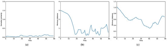 Illustration of the performance of interaction terms for MFG control (, , ). (a) Formation similarity error. (b) Minimum distance between UAVs and obstacles. (c) Minimum distance between UAVs.