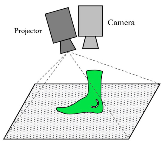 Another often used method for digitizing and measuring feet is 3D cameras [17,18,19,20,21,22,23,24]. There are different technologies, such as passive stereo, active stereo (e.g., structured light) and time of flight (ToF). Each of the technologies has strengths and weaknesses that can influence the result of the measurement. Passive stereo is the oldest and probably the most researched technology. RGB or gray-level images are usually used as input. Only ambient light is used to expose the image. This is also one of the biggest weaknesses of the technology because recordings in dark or dimly lit environments are not possible. To reconstruct depth information, one needs to establish a correspondence between each feature in one image with the matching feature in the other input images and then use these matches to triangulate the distance to that real-world point that gave rise to the image feature(s). Active stereo cameras are also based on triangulation, but unlike passive stereo, they often use infrared light projected with a specific pattern to illuminate the scene. However, since infrared light is also contained in sunlight, this technology is very susceptible to ambient light interference. Time of flight cameras mostly use modulated near infrared light (NIR) to illuminate the scene. The distance to the object is calculated by measuring the time the emitted signal needs to reflect back from the measured object. ToF is relatively robust to environmental effects compared to the other technologies, but it has other weaknesses such as flying pixels.
