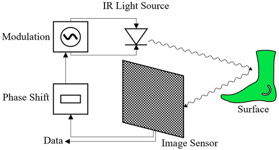 As can be seen in Figure 3, this method uses a modulated continuous wave of light to calculate the distance to an object. The phase shift between the emitted and received wave is measured. This phase shift is proportional to the distance of the reflecting object. Mostly either square or sinusoidal waves are used for this [30]. One advantage of CW is that it lowers the requirements for the light source in comparison to pulsed light. Thus, a higher resolution of the depth image can be realized than with pulsed light [26].