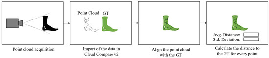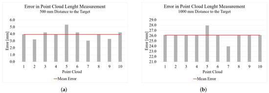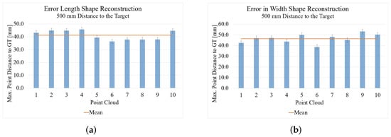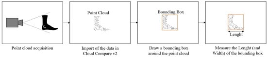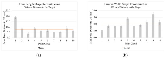 Then, for both the measurement of the length and the measurement of the width of the foot, 10 point clouds were recorded to determine the average error in the measurement as well as the standard deviation. The remaining experimental setup in this experiment is the same as described earlier in Section 2.1.3.