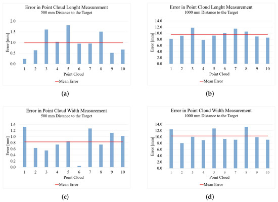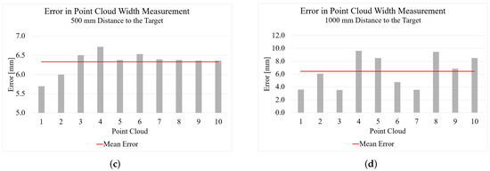 Results of the foot measurement with the Intel RealSense D455 SL camera: (a) length results from 500 mm; (b) length results from 1000 mm; (c) width results from 500 mm; (d) width results from 1000 mm.