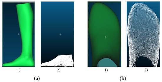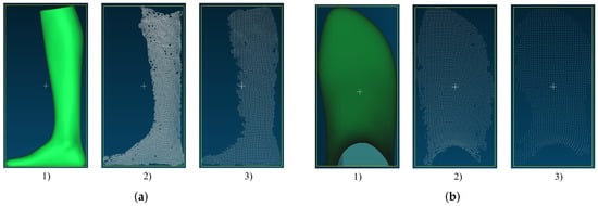 Example of point clouds recorded with Intel RealSense D455 SL camera: (a) point clouds of the foot model generated for length measurement: (1) GT, (2) length measurement (500 mm), (3) length measurement (1000 mm); (b) point clouds of the foot model generated for width measurement: (1) GT, (2) width measurement (500 mm), (3) width measurement (1000 mm).