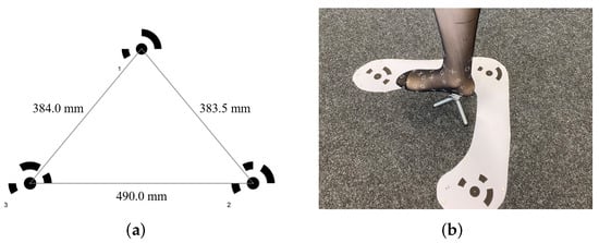 For the reconstruction of the foot model, 41 images of the foot were acquired from different positions. Since the procedure did not work with the foot model itself, which is too smooth and has too little texture, a very thin sock with a drawn pattern was placed on the foot as seen in Figure 10b, which should not have much influence on the shape of the foot. To properly scale the foot in Agisoft Metashape, the arrangement of targets in Figure 10 was used. The distance between the targets was measured to use this information as a size reference in Metashape. The targets were cropped to remove as much white area as possible because the algorithm has difficulty or even no possibility to use areas without texture.