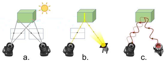 Depth Sensing technologies. (a) Passive stereo. (b) Structured light. (c) Time of Flight.