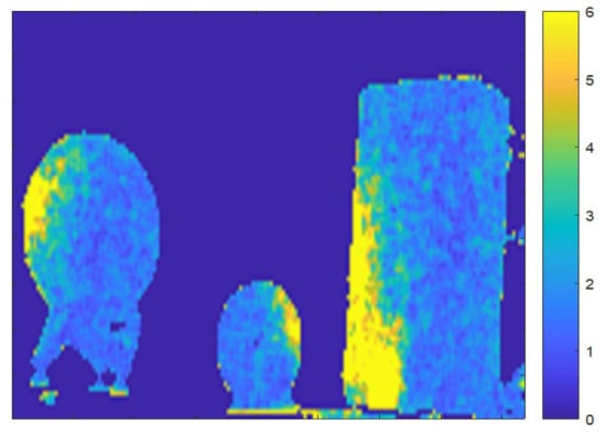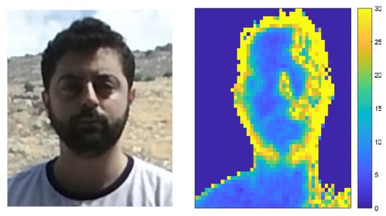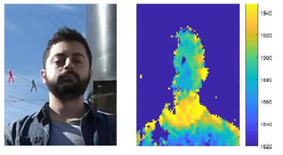 As mentioned in Section 2.2, depth cameras do not perform well under outdoor lighting mainly due to the fact that natural light contains IR components which interfere with the IR light used by depth cameras [5,24]. Figure 12 shows this effect. A subject’s face was captured using a Kinect V2 camera with sunlight source on the right. The RGB image is shown on the left and the noise magnitude of the captured depth sequence (variance per pixel across all frames, as defined in Section 2.2) is shown on the right. It can be seen that noise values are larger on the right side of the face corresponding to a higher concentration of impinging light.