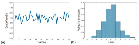 (a) Depth response at a pixel acquired over 50 frames by a KinectV2 [31]. (b) Histogram of noise at the pixel. Noise magnitude is defined as the variance of depth values and noise variance is defined as the variance of the absolute deviation values. In this example, noise magnitude is cm, and noise variance is cm.