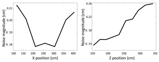 Noise magnitude as a function of horizontal position (X pos) (left) and depth (Z-pos) (right). Noise increases with horizontal distance from center and increases with depth (distance from camera).
