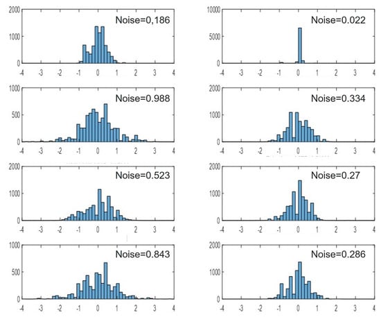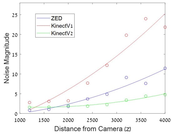 Across the sequence of depth images produced by the depth-cameras, noise is expressed as inaccuracy and inconsistency of the estimated depth. It can be considered as either varying spatially or varying temporally at a pixel. Axial noise is the temporal fluctuation of depth values at a pixel across multiple frames (see Figure 6). It has been shown to increase quadratically with the distance of objects from the camera [2,3,4,18,27,28,29,30] (see Figure 7). The source of this behavior may be the decrease in amplitude of the projected IR light in ToF cameras or the dependency between disparity and depth in the stereo and structured light cameras.