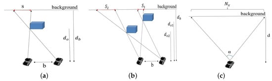 Consider the scene and camera configuration shown in Figure 16a viewed as a projection onto the x-z plane of the camera coordinate system. The scene contains an object (blue box) with a background object or plane behind it. Denote by b the camera baseline, i.e., the distance between the two camera components. Let be the distance from camera sensor to the object and be the distance from camera sensor to the background. Let s denote the shadow width. (we consider only the horizontal geometry along the x-axis). Using simple geometry and triangle similarity, we have: