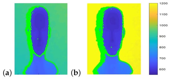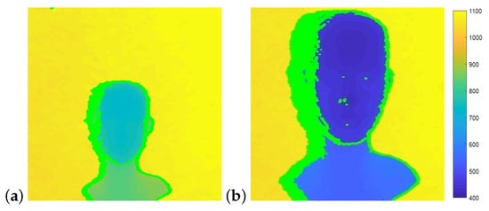 In both images, the distance from camera to the background is 1150 mm. The distance from camera to object is (a) 770 mm and (b) 450 mm. Shadow pixels are marked in green on the left side of the head. The smaller the distance from object to camera, the wider the shadow.
