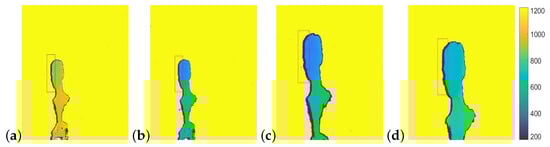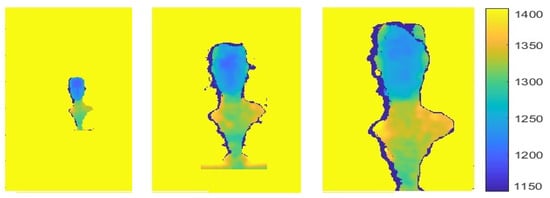 Finally, if the object and shadow are re-sized to obtain the shadow width as computed for the scaled depth value (40.11 mm), as shown in Figure 20d, we find inconsistency in the object’s size compared to its real world size. In the example, reverse-projecting the head in the image (from pixels to millimeters using Equation (6)) results in a head size of 230 mm (while real human heads average approximately mm ).