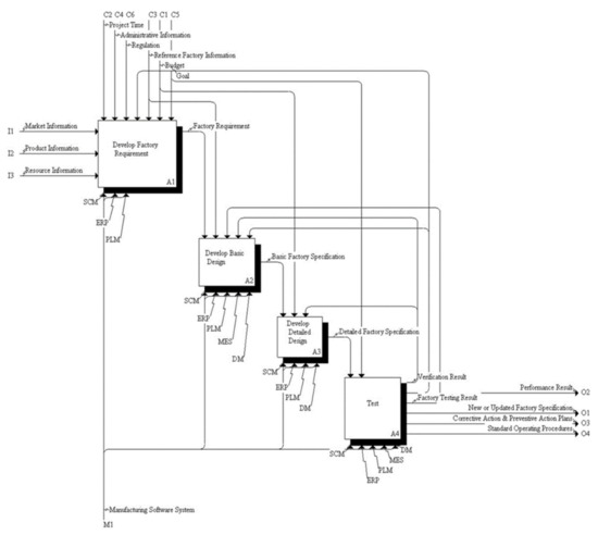 As mentioned earlier, the integrated monitoring system must simultaneously support various environments such as cloud, web, and mobile, acquired data from heterogeneous legacy systems from time to time, and support interfaces with various software such as analysis tools. International standards exist for each domain area [32] (e.g., MES, PLM, VR, etc.), but they are not commonly used in the real field except STEP. For flexible integration, it is necessary to develop a data model to build digital twins connecting heterogeneous systems. The data model introduced in this paper was defined based on the FDI reference model developed by the NIST to improve the smart factory design. The FDI reference model is based on the business process related to the factory/manufacturing line/process/machine of a global manufacturing company and is composed of 4 activities and 28 tasks as shown in Figure 2 and is modelled as IDEF0 [33].